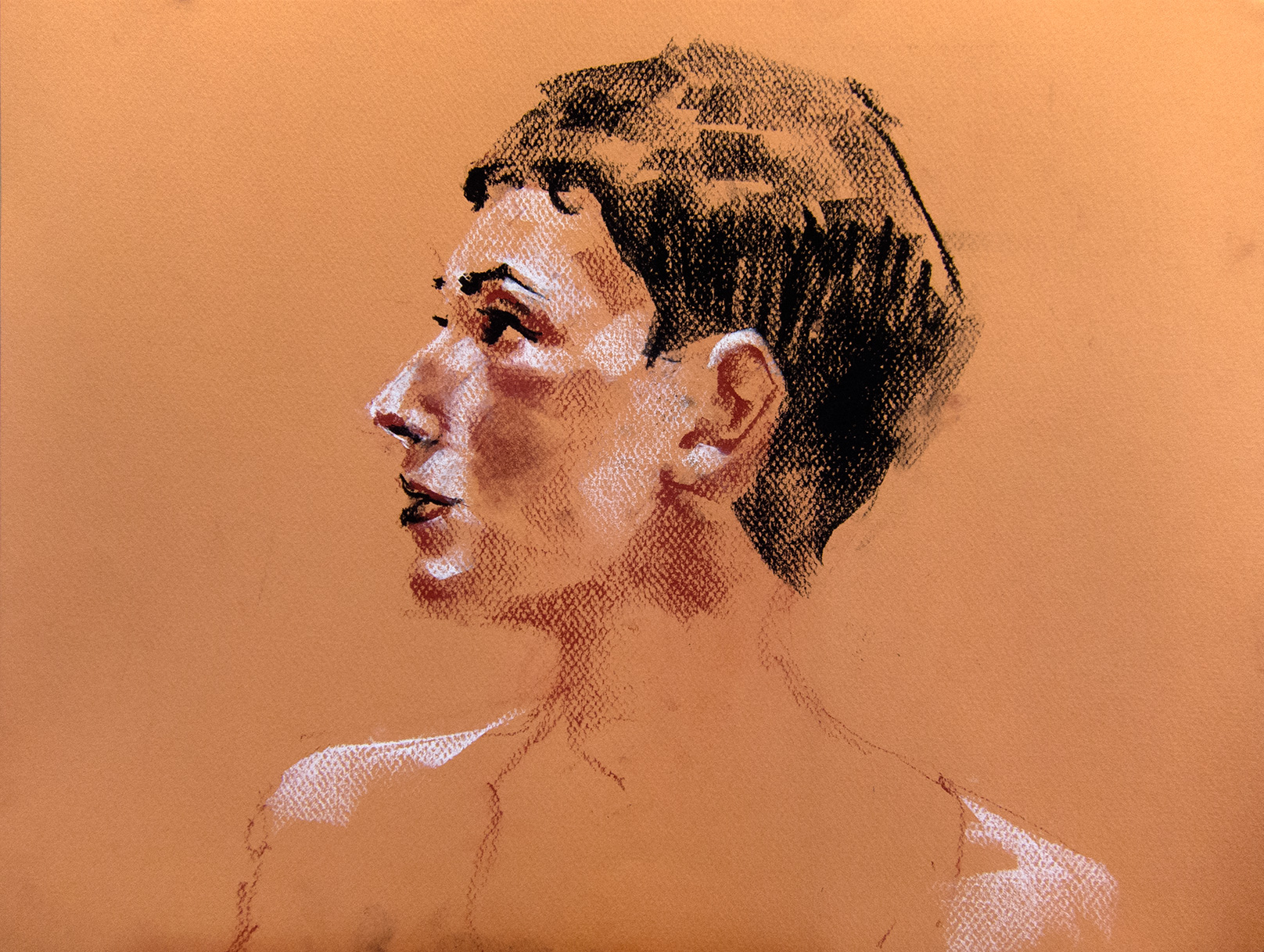 The first drawing is the last pose Bella sat for us, and it shows the profile of her face looking upwards towards the light source. It was rendered using black, white, and earth colored crayons on an orange paper. She has a short pixie cut hairstyle that is drawn in black. The light glances her brow, nose, cheeks, and shoulders which are drawn with the white crayon. The midtowns come through the paper ground and are rendered using the earth toned crayon.