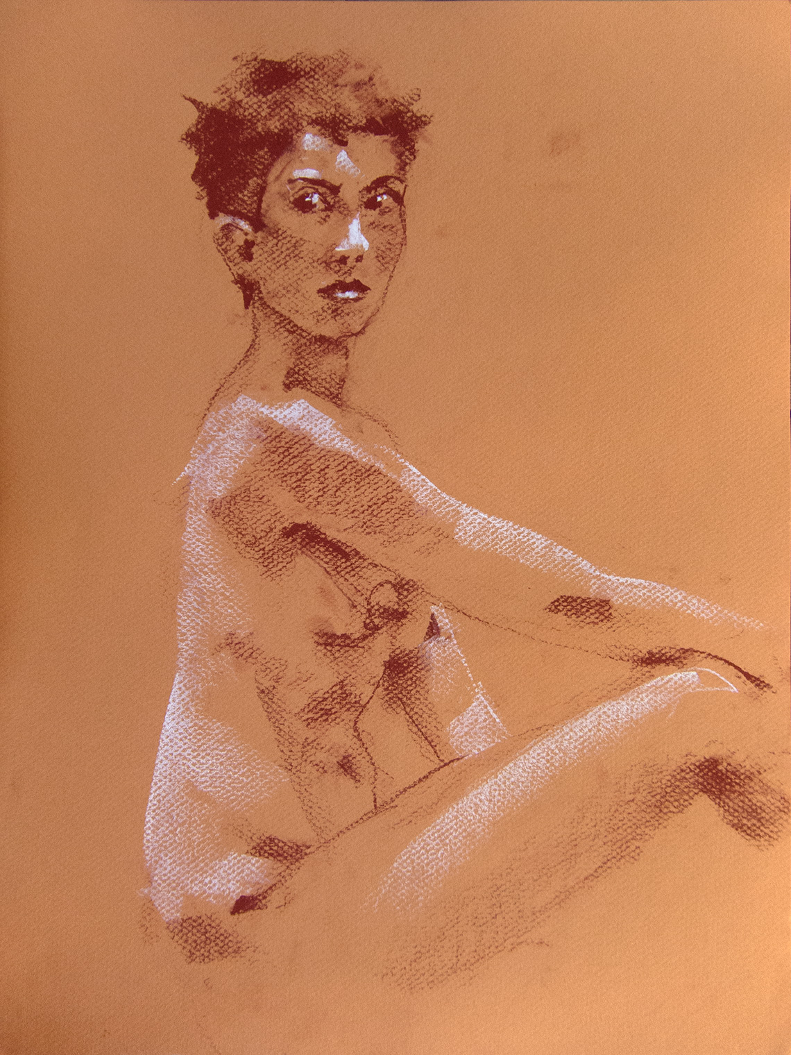 The final drawing was the shortest of the three poses (15 minutes) and shows Bella’s elegant torso and a large portion of her right leg. The drawing is done with earth and white crayons on orange paper. Bella is sitting on the ground looking over her right shoulder and her right arm is extended over her right knee. The light falls gracefully over her shoulders, back, and thigh. Her stomach and breasts are rendered with midtown and shadow values using the earth crayon. Her eyes glance far to her right and the light brightly twinkles in her irises.