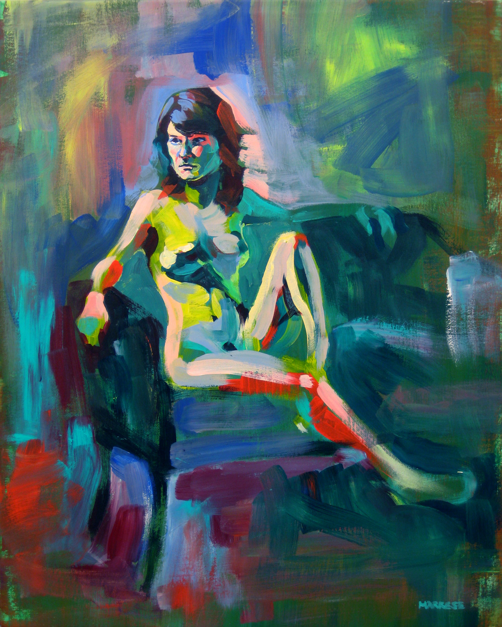 The first painting is a 24 by 30 inch acrylic painting that was done at the open session in Benedictine University. The painting shows her sitting on a small couch with her arms resting on the back and side. Her right leg is extended out, resting on an box that was not rendered in the painting, and her left leg up on the couch. Jordan was posing for about 2 hours, and I spent those 2 hours fervently painting with expressive strokes and taking risks with the colors I chose to use. Under those tight circumstances, quick decisions need to be made and you have to be willing to let go of rendering every detail, which is why the legs and hands are so vague and gestural.