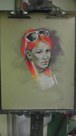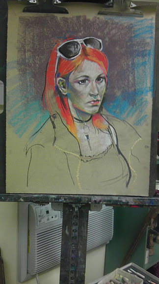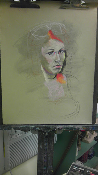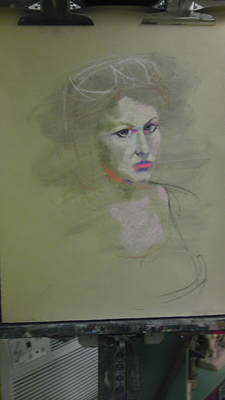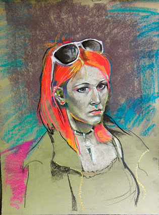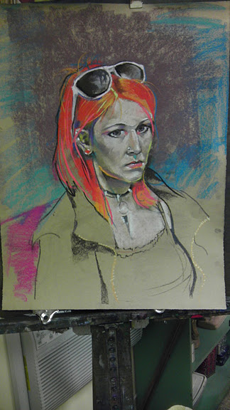 I have been attending the bi-weekly open studios at Main Street Art Centre in Lake Zurich, Illinois, and this week, I made this portrait of an artist named Erica. She had a unique style and was wearing a lot of jewelry which I managed to squeeze in after the last break. I didn’t get to develop her clothing though, and her black leather jacket would have offered a nice contrast with her skin and hair increasing the drama. Oh well.