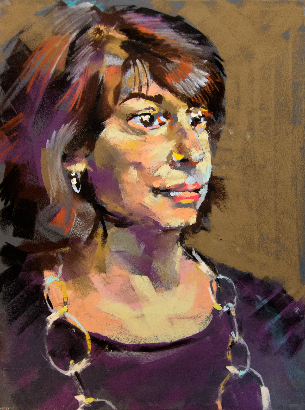 The portrait of Kristi was done during a live 3 hour session and shows her looking contemplatively in the distance. Her full black hair has multidimensional highlights rendered in various hues, and she is wearing a plain black blouse with a long silver linked necklace. The lamps glimmer off her silver earrings and the light slides through each silver stranded loop.